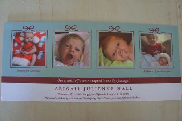 Abigail Julienne was born on Thanksgiving Day, November 27, 2008 at 12:49 PM, 8lbs 1oz, 21 1/2″