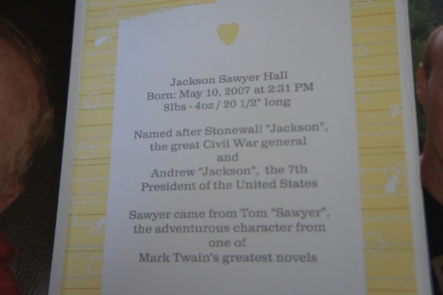 Jackson Sawyer had a due date of Mother’s Day/my birthday the 13th. He was born on May 10, 2007 at 2:31 PM, 8lbs 4oz, 20 1/2″