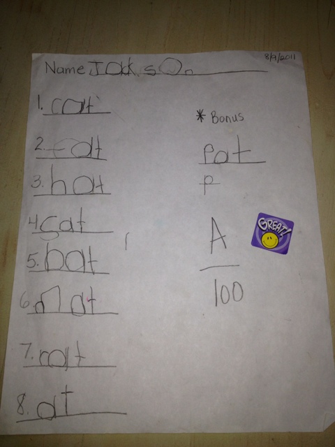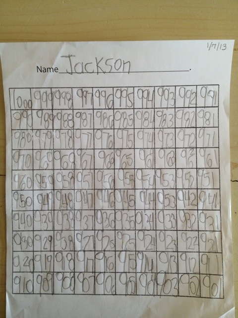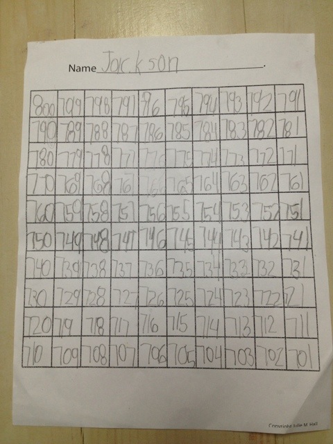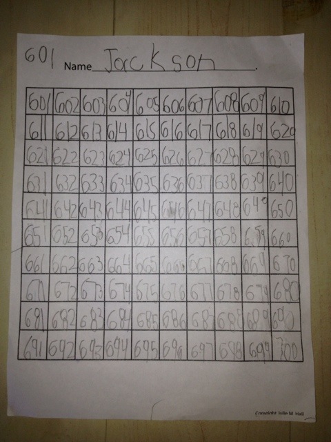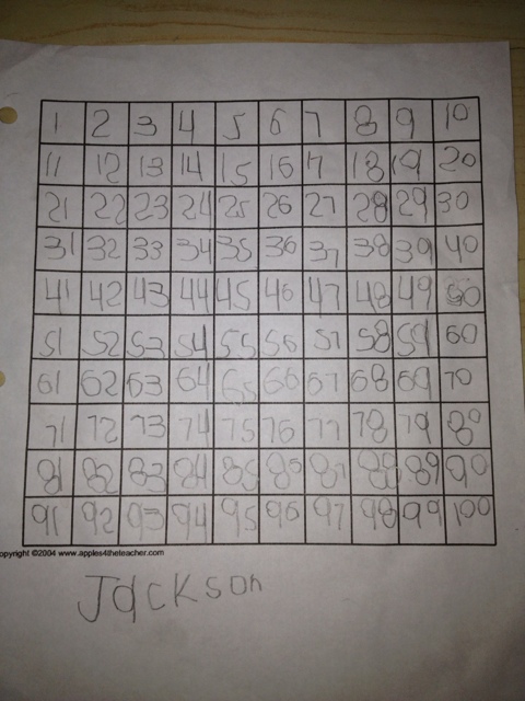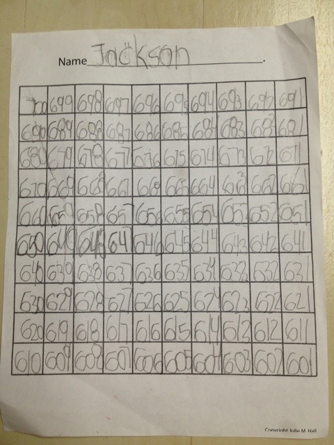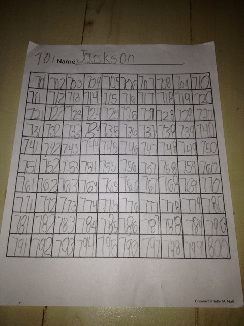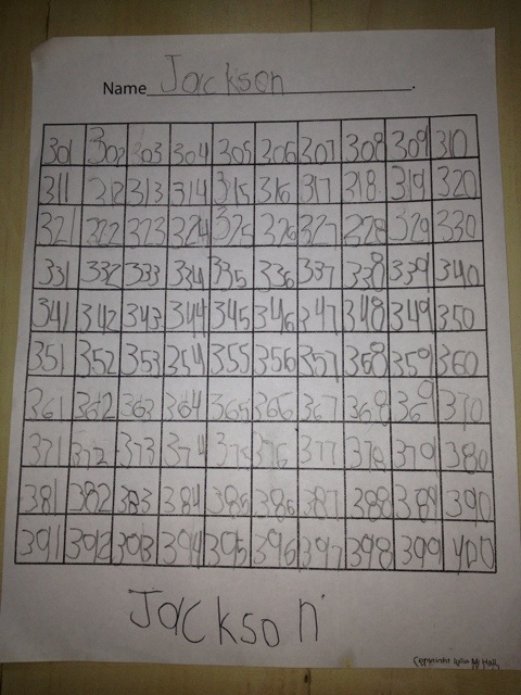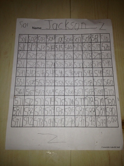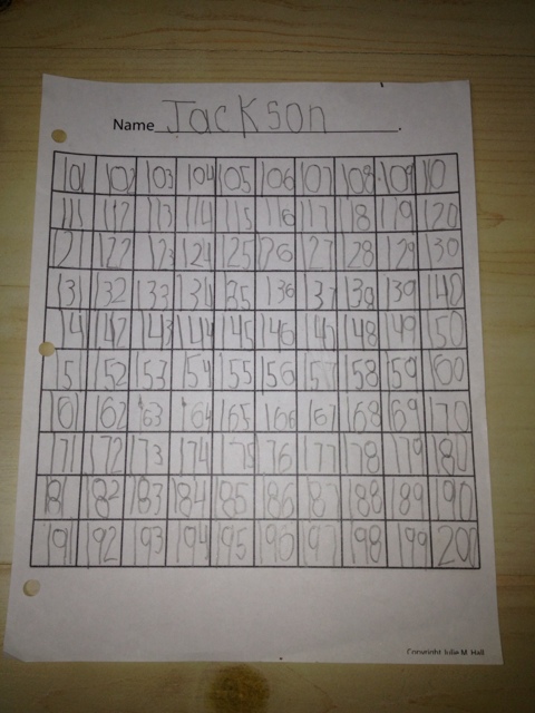 Math fact drills numbers to 10 and numbers to 20. Also we will do timed math test daily. Jackson will complete writing his numbers to 1,000 by Christmas and then write backwards to one in the Spring.