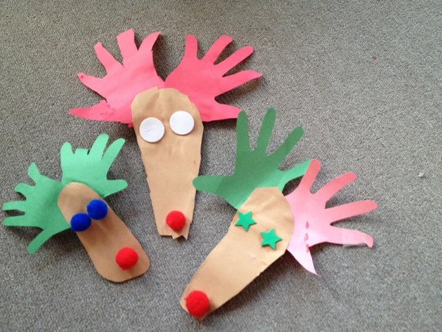 Feet and hands making a reindeer. We couldn’t find our googlie eyes so we made do with stickers.