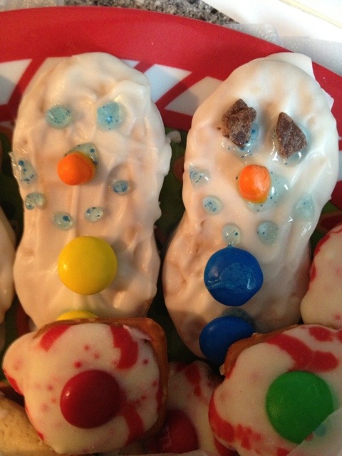 This is an example of our nutter butter snowmen we created. We also made peanut butter blossoms, mint pretzel hugs, cut out sugar cookies, and other bars and brownies. The hit was our reindeer munch with M&M’s!