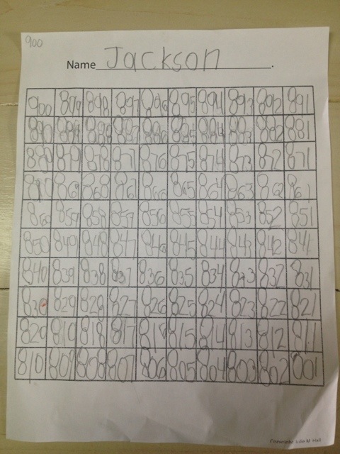 We posted when Jackson completed his goal of writing to one thousand by the end of the year. He had a great idea to now try and work backwards to one! I admit, I never had that goal for the children in my classroom years back, but I’m excited he thinks it’s a good goal! He completed the first step from 1,000 to 901.