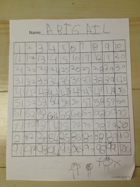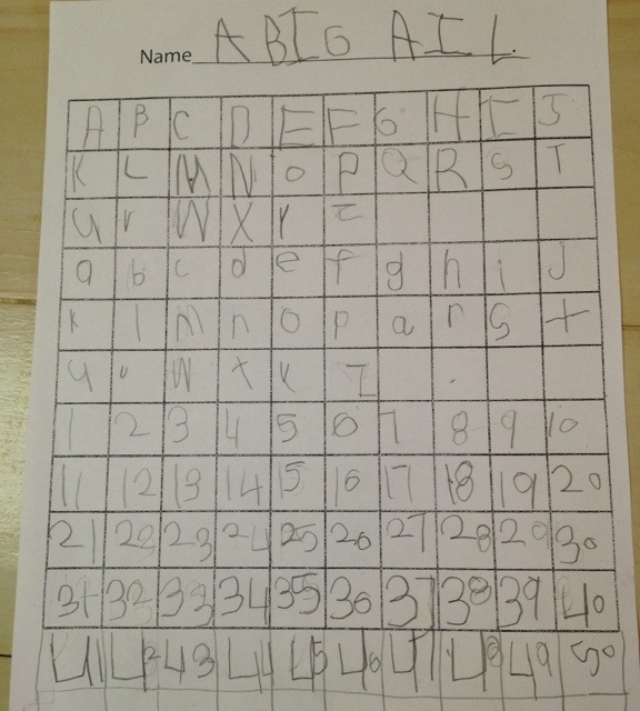 Finally, all finished! We have been working hard on our upper and lower case letters. All are from her memory, but I had to show her again three or four of them. Also, we are trying to make it to 100…we have a way to go! She has yet picked up on the pattern of the numbers. I am hopeful!