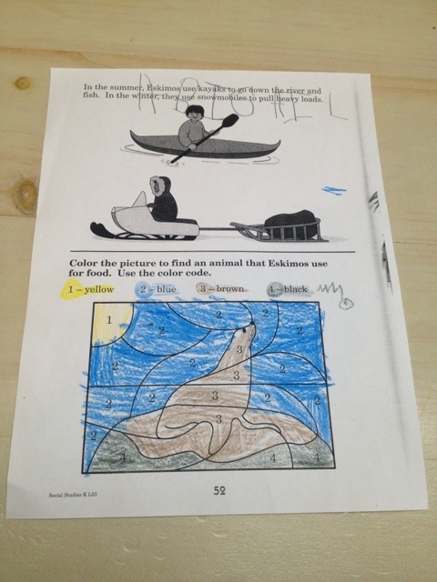 Abigail continues to work on her coloring skills. We are trying to recognize/read a few of the color words and following a key to complete pictures. We have talked about Eskimos, how they live, and where they are most likely living on the map in Social Studies. When she finished she was very pleased that her different colors had created a seal on a rock!