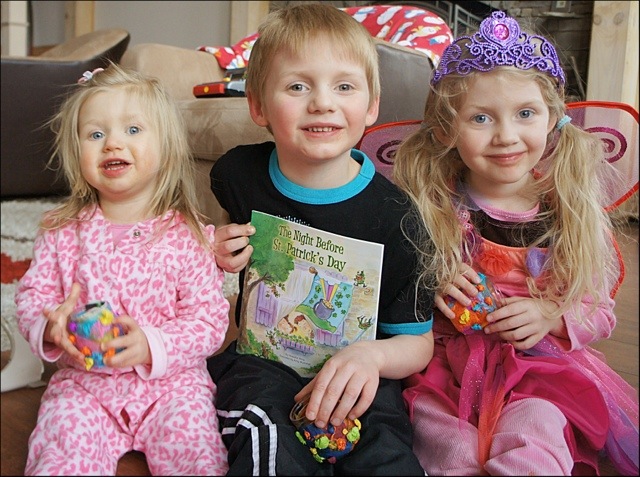 We also made our own little pots using baby food jars and decorating with glue and tissue paper. After reading “The Night Before St. Patrick’s Day” by Natasha Wing, we placed our jars on the front porch hoping to be filled with tiny treasures. Although this book was humorous and had good pictures, Jackson and Abigail were both a little scared of the tiny little red headed man. We read it before bed, afterwards I had to convince them the leprechaun would not be entering our house while we slept…which is why our jars were put outside the front door! They were excited to find chocolate coins, stickers, and loose change the next morning.