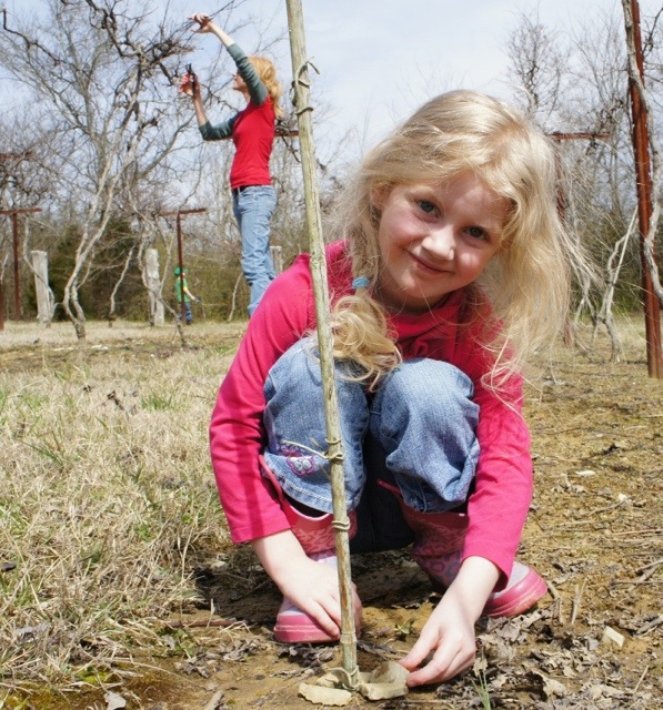 Abigail sitting under completed pruned vines, with a puppy of course.