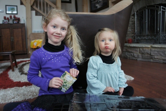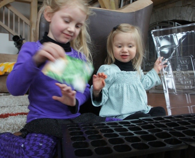Getting a head start on spring seeds…indoors. Isabela enjoying the planting with a mouthful of Goldfish!