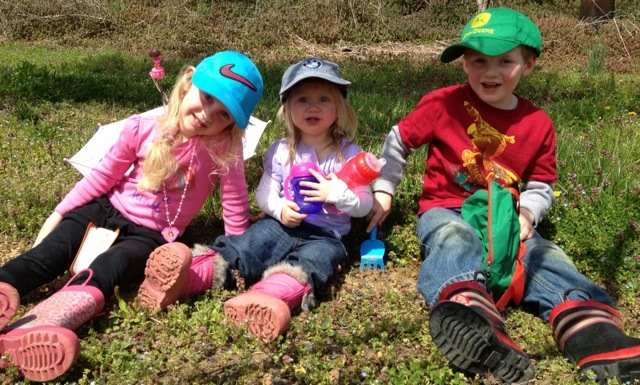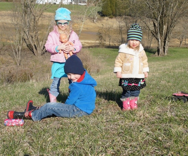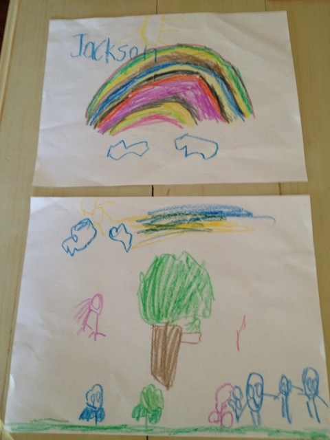 A couple Earth Day drawings by Jackson. A rainbow and Jackson and his two sisters enjoying the outdoors.