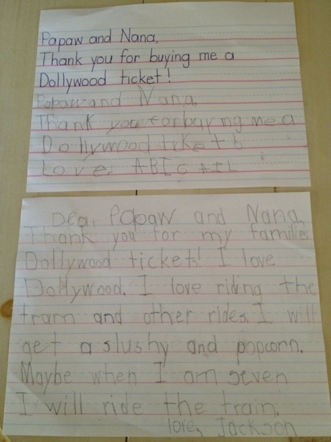 Papaw and Nana treated the WHOLE family to Dollywood tickets again this year! Jackson’s final sentence cracks me up! When I read it and reminded him he would be six on his birthday, he told me he knew, he still wouldn’t be ready for the real train until he was seven!