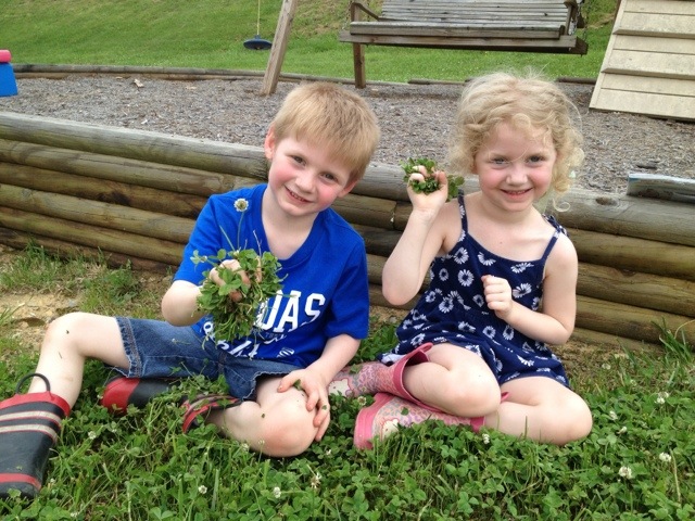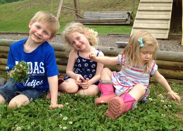 We even talked Aunt Fran into helping us plant the corn. Check out the wild boys in the background. Also, that’s our onions and potatoes we helped plant several weeks ago!