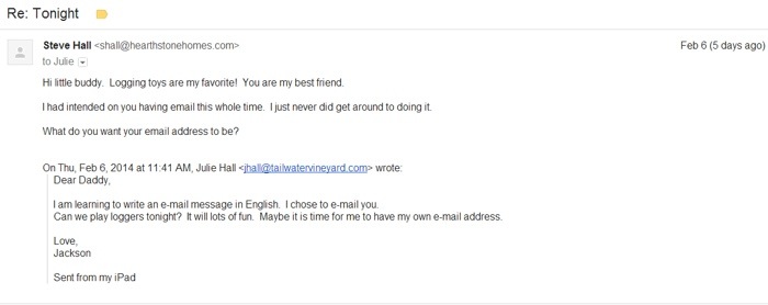 An English assignment. He was a little teary eyed when he read his Daddy’s reply.