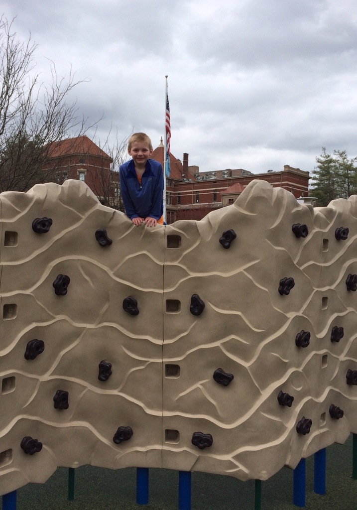 A dark photo I know. However, he made it to the top and even climbed over the wall!