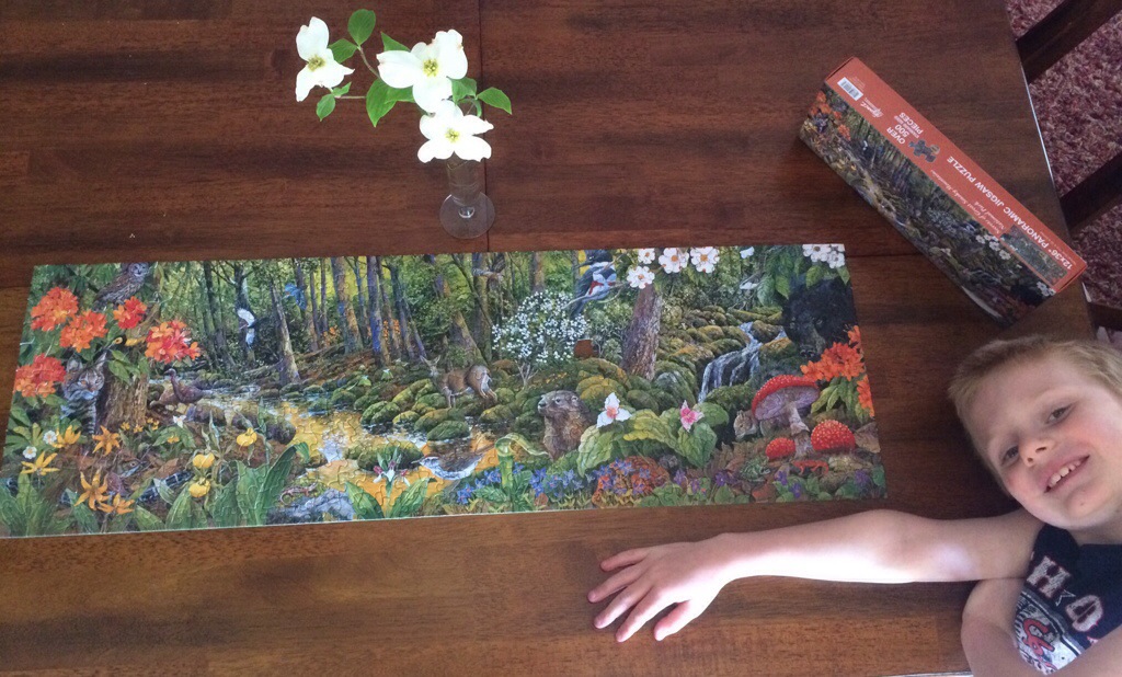 Proud of his completion to his new Smoky Mountain puzzle. Over 500 pieces, it took him about two weeks to finish. One missing piece…