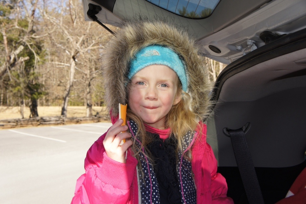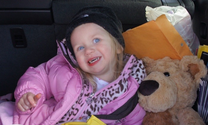 Baby girl is happy to be out of the cold wind, filling her belly, and playing in the car with her favorite siblings!
