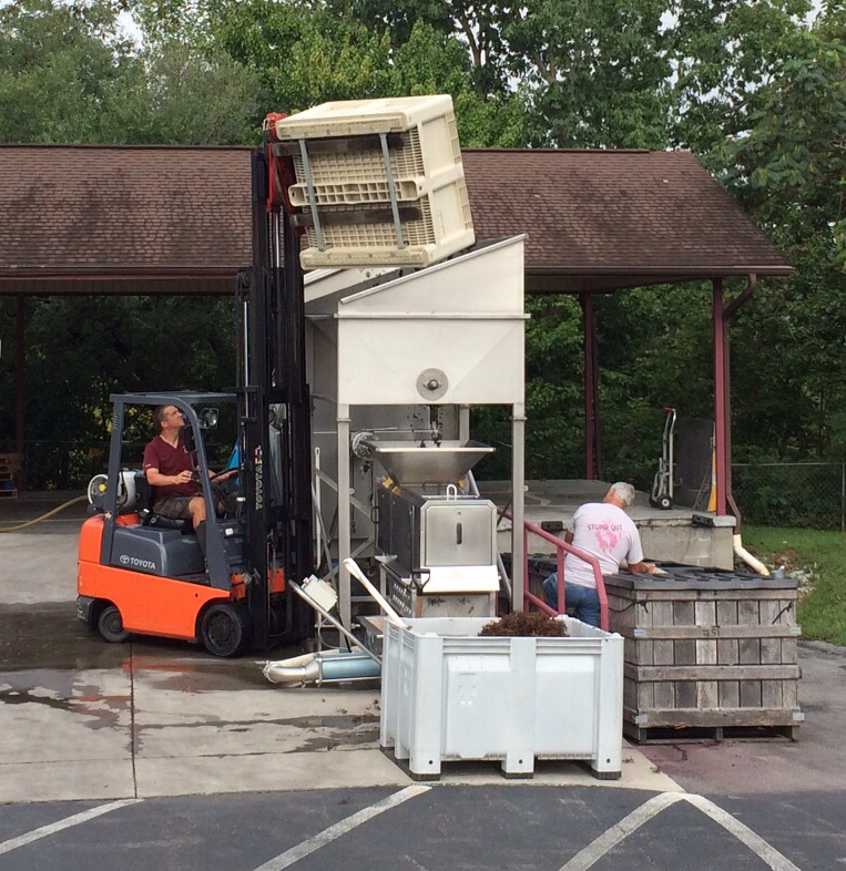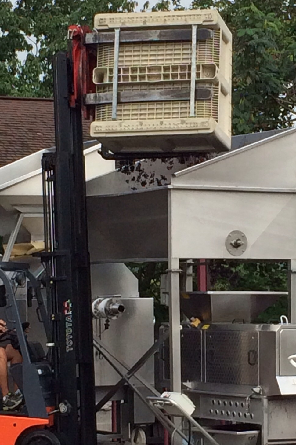 1/2 ton macrobins dumping into the crusher/destemmer . . .